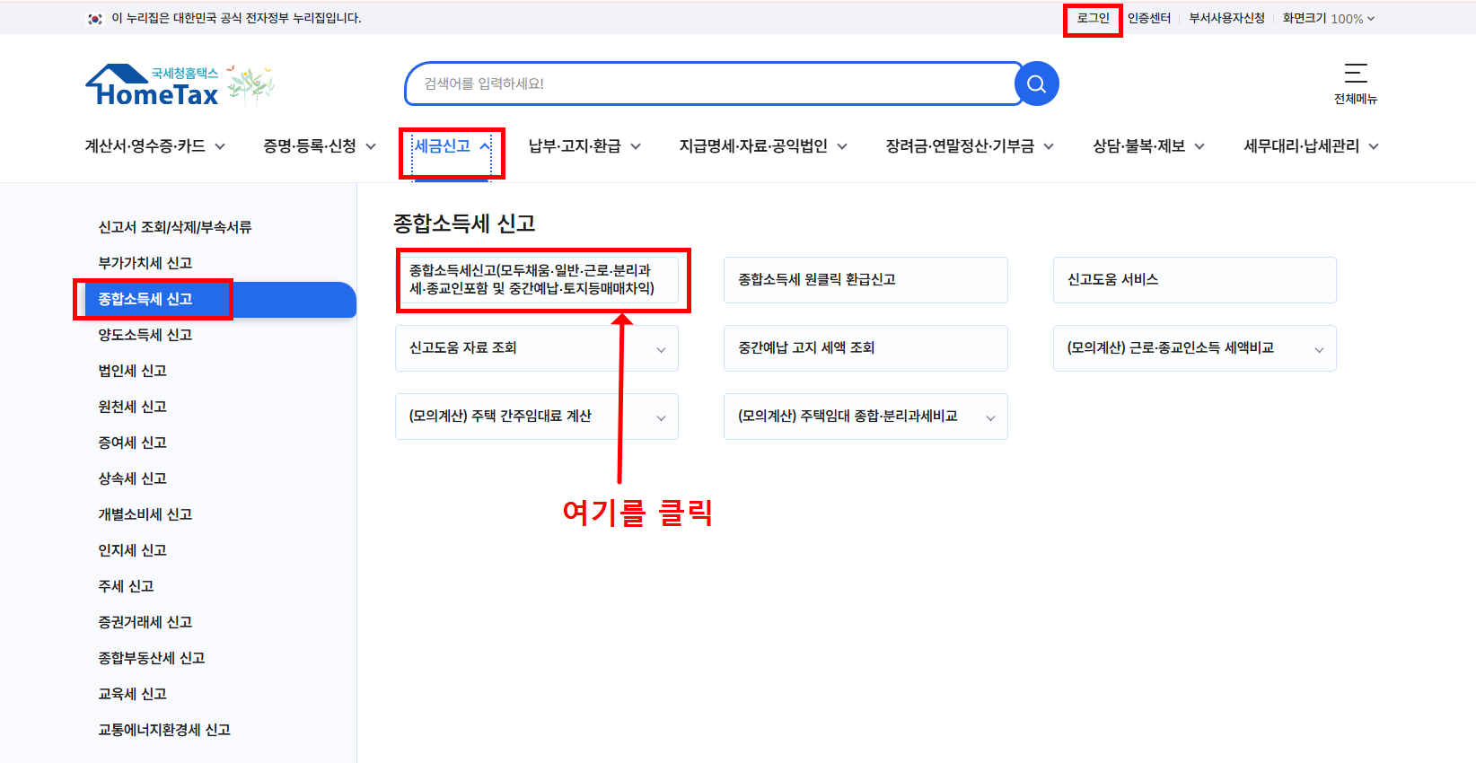 - ‘종합소득세 신고’ 클릭