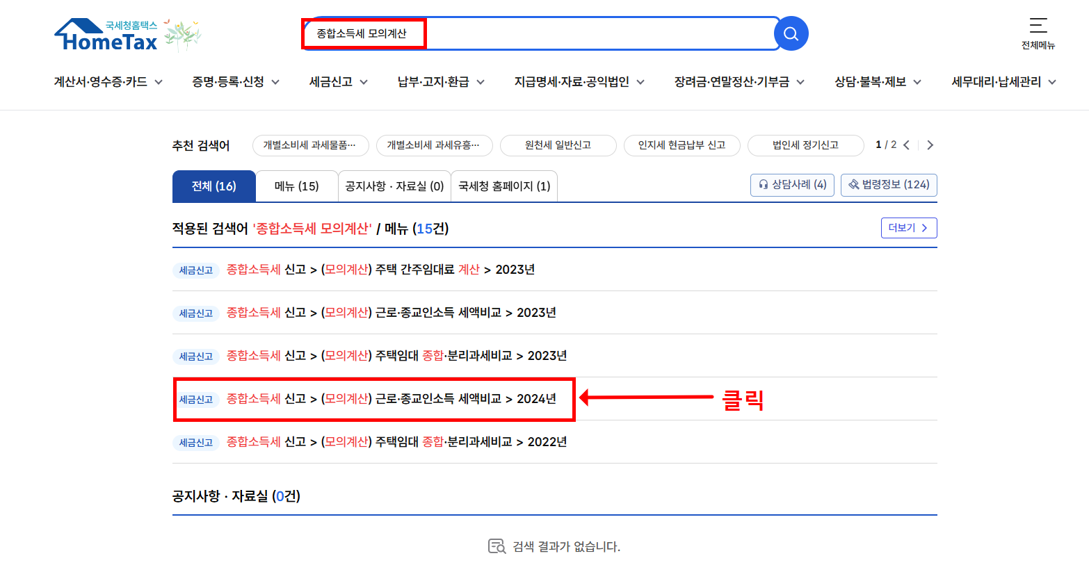- 홈택스 접속 후 '종합소득세 모의 계산' 검색
