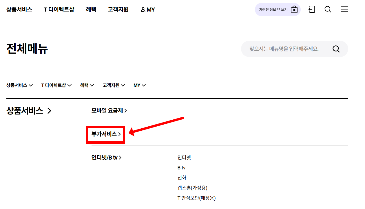 ✔ 로그인 후 상단 메뉴에서 ‘부가서비스’ 선택